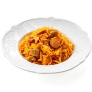 Mix the tomato paste with water, pour this mixture over the cabbage, add the sausages, return the meat to the skillet, and simmer covered on low heat for about 30 minutes, until the cabbage is tender. At the end, season the soup with salt, pepper, and sugar to taste.