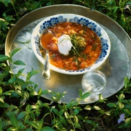 Remove the soup from the heat, let it steep for ten minutes, and serve, garnishing each bowl with sour cream, chopped parsley, and thinly sliced garlic shoots.