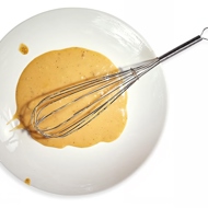 Gradually add olive oil, whisking the contents of the bowl until it becomes mayonnaise.