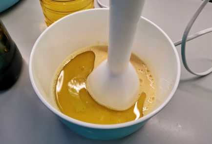Gradually pour in the mixture of olive and vegetable oils while simultaneously blending the mixture with an immersion blender. As a result, the sauce should thicken and have a consistency similar to mayonnaise.