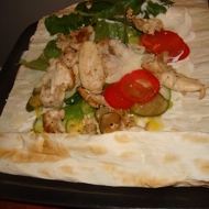 Spread a thin layer of mayonnaise on the lavash, place torn romaine leaves on top, then add pieces of chicken, Parmesan, drizzle with dressing, and roll it up neatly.