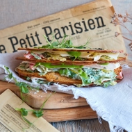 Slice the bread thinly and toast it in the oven. Assemble the sandwich salad. Spread the Caesar dressing on the toasted bread, add some salad and slices of Parmesan, cover with a second piece of bread, and repeat. Garnish with watercress.