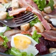 Boil the eggs hard, cut into quarters. Grill the bacon for a few minutes on each side, then cut into small pieces. Toast the bread in the oven and cut into cubes.