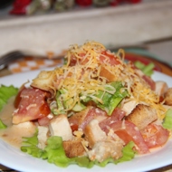 In a large bowl, tear or chop the Iceberg lettuce, cut the tomatoes into halves or quarters, crush the remaining garlic, finely chop the eggs, grate the cheese, add the chicken and Caesar dressing, and mix everything together.