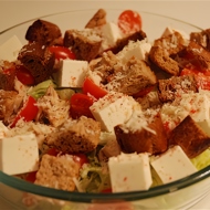 Place the lettuce leaves on a plate. Top with feta, then the chicken breast, cherry tomatoes, and croutons. Sprinkle everything with grated Parmesan. Season with salt and pepper.