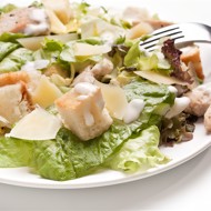 Boil the chicken breast and let it cool. Then cut it into small cubes. Chop the lettuce (ideally, use Napa cabbage) coarsely. Mix the lettuce, chicken, and croutons, dress with mayonnaise, and sprinkle grated Parmesan on top.