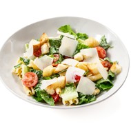 Combine the pasta with the lettuce leaves and tomatoes. Dress with Caesar dressing and toss to combine.