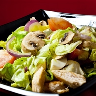 Add the dressing to the salad and toss to combine. Stir in the cheese, and season with salt and pepper to taste. Divide the salad among plates, top with the mushrooms, and serve immediately.