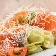 Dress the salad with Caesar dressing (can be bought at the store or made at home — recipe available on this site). Sprinkle with grated Parmesan.