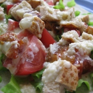Wash the lettuce leaves, tear them into pieces by hand, and place them on individual plates. Add the diced tomatoes (if using cherry tomatoes, cut them into quarters), chicken, drizzle with dressing (not too much), and add croutons. Season with salt and pepper if desired.