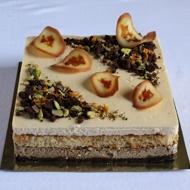 Remove the cake from the pan. Trim the edges. Decorate with crushed chocolate cookies, ground pistachios, and orange tuiles.