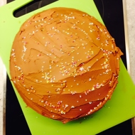 Place the first layer on a plate and spread with frosting, then add the second layer on top and frost it as well. Decorate the cake with sprinkles.