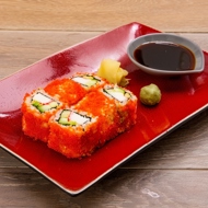 Using the mat, form a tight roll, giving it a rectangular shape; seal the roll by pressing the rice that overhangs the edge; on a flat surface, distribute half of the roe and roll the finished roll in it.