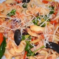 Add the pasta, heat through, gently stir, and combine all the ingredients. Next, remove the pits from the olives and chop or crush them into large pieces. Add to the saucepan.