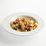 Place the cooked potatoes in a deep plate, season with salt, add a ladle of sauce, and mix well. Drizzle with additional sauce on top, add slices of cheese, and season with freshly ground pepper and salt.