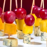 Thread the grapes, mango, and blue cheese onto toothpicks.