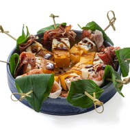 Serve the canapés with persimmon and prosciutto at the festive table.