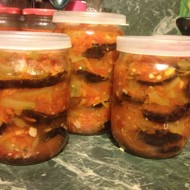 Then, in sterilized jars, layer the eggplants, sprinkle with garlic, and pour over the sauce. Repeat the layers several times.