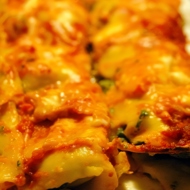 Wash the basil and separate it into leaves. Lightly whip the cream with the egg. Add thyme and basil leaves. Arrange the cannelloni in a narrow baking dish in two rows. Preheat the oven to 392°F. Drizzle the cannelloni with the sauce and sprinkle with the remaining parmesan on top. Place in the oven for 15 minutes.