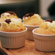 Grease the muffin tins with butter, and fill them with the batter. After the first layer of batter, I placed a piece of chocolate, then added more batter on top. As a result, the chocolate ended up on top.