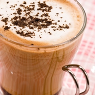 Pour the hot coffee into cups, then add the milk with chocolate. Sprinkle cocoa powder on top.