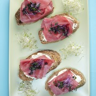 Place a piece of ham on the bread — the canapés are ready.