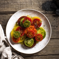 Slice all the tomatoes into evenly thick rounds and arrange them beautifully on a platter, with the larger ones on the bottom and the smaller ones on top.