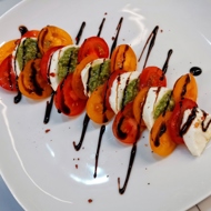 On a plate, arrange the tomatoes, placing one slice of cheese on top.