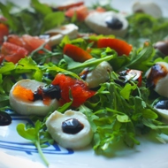 It's better to use cherry tomatoes, which don't look too plastic even in winter, and to enhance the tomato flavor, add sun-dried tomatoes as well.
