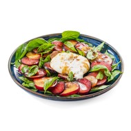 Arrange the slices of plums on the leaves, leaving space in the center for the burrata.