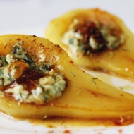 Transfer the pears to a plate, fill the core of each half with a teaspoon of cheese, and add some chopped walnuts. Sprinkle with a pinch of rosemary, cinnamon, and sweet paprika or red pepper.