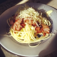 In the skillet with the ham (which is still on the heat) and bacon, add the cooked pasta, stir, and then pour in the cream mixed with the eggs. Mix everything well once more until the spaghetti is completely coated in the cheese and cream.