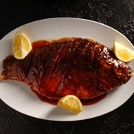 Place the cooked carp on a plate, drizzle with the prepared sauce, and arrange the sliced lemon alongside.