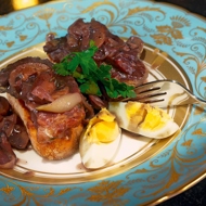 Drizzle the finished croutons with wine sauce and place a piece of carp on each. Garnish the dish with parsley and serve with hard-boiled eggs, sliced into narrow wedges.