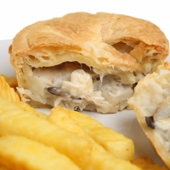 Roll out 2 circles of yeast dough. Place the potatoes, fish, and sprinkle with pepper on one layer of dough. Top with onion and add salt. Cover with the second layer of dough.