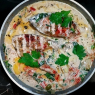 Carp Steak on a Creamy Vegetable Bed