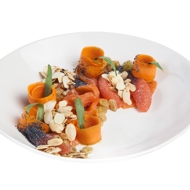 Combine the sauce with the carrots, pieces of grapefruit, tarragon leaves, raisins, and thin slices of lightly salted salmon. When serving, sprinkle with almond flakes and poppy seeds.