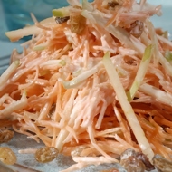 Grate the large apple on a coarse grater. In a bowl, combine the carrots, apple, and raisins.