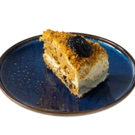 Carrot cake with fluffy sour cream frosting, nuts, and prunes, resting on a lightly crumbly, slightly springy orange sponge cake — a symbol of carefree gatherings in cafés, the kind of dessert that lifts our spirits in no time and is never too much to enjoy.