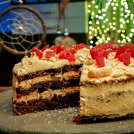 Let the cake cool, then cut it lengthwise into three layers. Spread each layer with quince jam, and then add the sweet potato mousse.