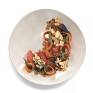 Slice the fish very thinly and arrange the slices on individual plates. Add grapefruit segments, seasoning them with sea salt, and neatly place ribbons of carrot. Include raisins, having dried them beforehand, and garnish the salad with almonds, poppy seeds, and tarragon.