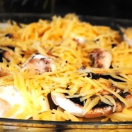 Grease a baking dish with vegetable oil and layer the ingredients: potatoes (add salt), zucchini, mushrooms (add salt and pepper).