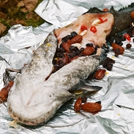 Wrap the fish in foil and place it on the glowing coals dorsal side down. After half an hour, flip it over. Make sure the coals are glowing, not burning.