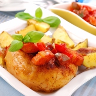 Place the pieces of chicken in a deep dish. Add the onion, tomato paste, vinegar, fat, and a little water. Season with salt and pepper to taste. Cover with a lid and simmer in the microwave at full power for 7 to 8 minutes.