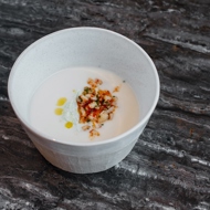 When serving in a bowl with soup, place the mascarpone dumpling, black caviar, basil oil, and fresh tarragon.