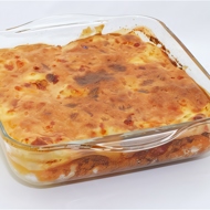Remove the dish from the oven. Run a knife along the edge of the dish. Cover the pie with a plate and flip it over. Drizzle with warm tomato sauce and serve immediately.