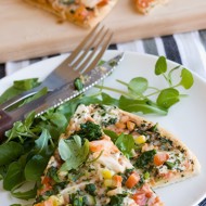 Add the filling: pieces of carrot, onion, tomatoes, green peas, and cauliflower, sprinkle with grated cheese and herbs.
