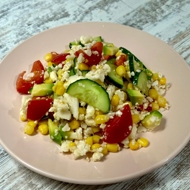 Combine the vegetables in the salad bowl with the cauliflower, and add the corn.
