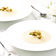 Ladle the soup into bowls and top with croutons and crispy parsley.
