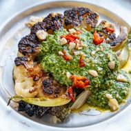 Cut the head of cauliflower into 2 cm thick steaks using a sharp knife. Briefly blanch them and then place on a hot skillet with olive oil. Sear on high heat for 2 minutes on each side.